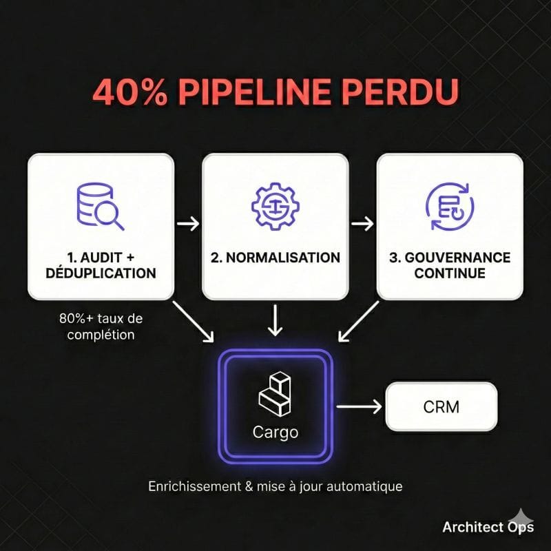 Résultat ? Des doublons partout, des champs vides à 60%, des opportunités mal qualifiées, et un forecast avec 50% de fiabilité.